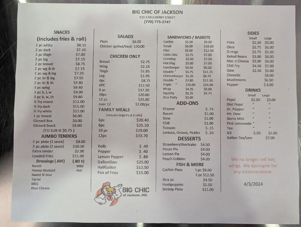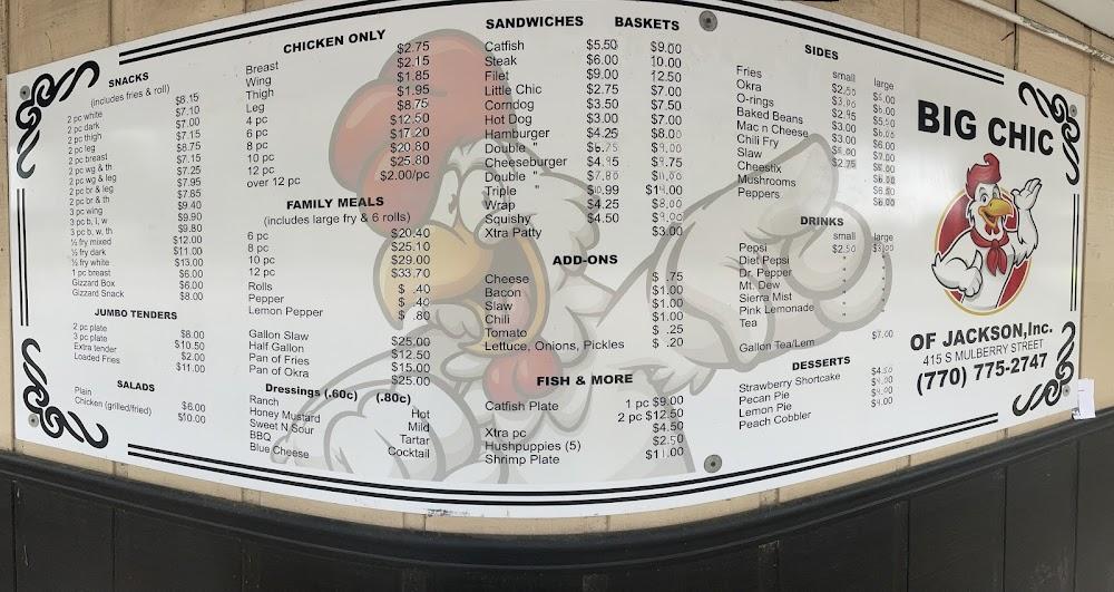 Welcome to Big-Chic of Jackson Inc, your premier destination for delicious chicken dishes in Jackson, GA. Located at 236 Macon Ave, we offer a casual and vibrant atmosphere perfect for families and solo diners alike. Enjoy a diverse menu featuring traditional comfort food, quick bites, and an impressive selection of teas. Our services include dine-in, takeout, and delivery, ensuring a satisfying meal no matter your preference. With accessible seating, outdoor dog-friendly areas, and ample parking, we prioritize convenience for all our guests. Join us for lunch or dinner, and experience the welcoming ambiance that keeps our clientele coming back!